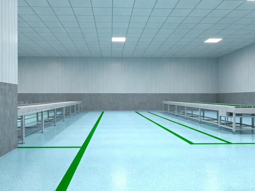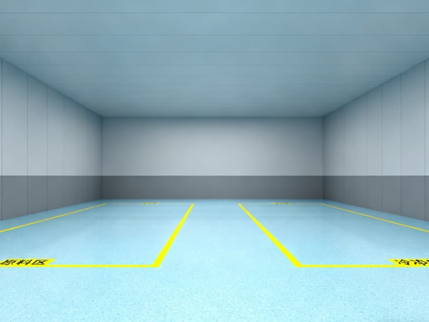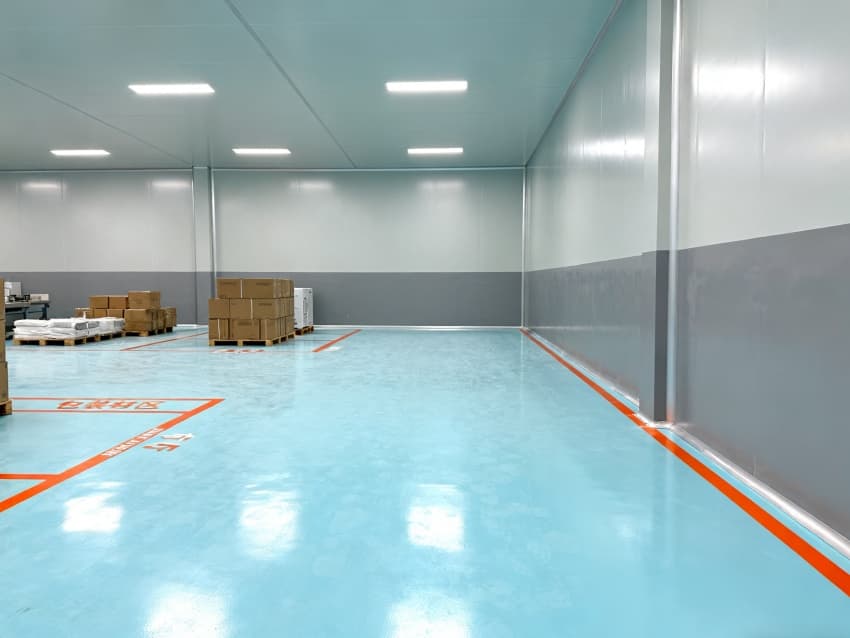 車間統(tǒng)一采用淺藍(lán)色耐磨環(huán)氧地面,兼具抗沖擊、易清潔特性,適配鈑金加工、總裝等多環(huán)節(jié)的設(shè)備安裝與物料轉(zhuǎn)運需求;四周灰色防霉墻壁經(jīng)耐污處理,耐磨損且不易顯臟,配合頂部均勻布光系統(tǒng),營造明亮舒適的生產(chǎn)環(huán)境。?