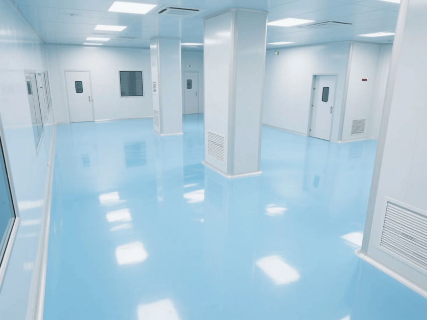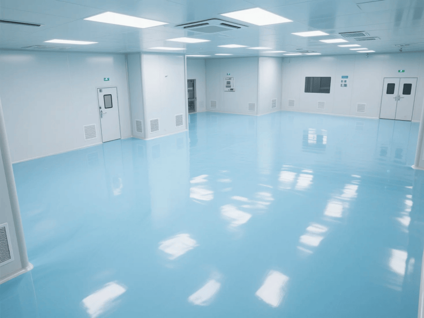 地面系統(tǒng)采用3mm厚環(huán)氧防靜電自流平地坪,表面電阻穩(wěn)定在10^6-10^9Ω范圍,耐磨系數(shù)達0.6以上,滿足電子元器件生產(chǎn)的防靜電要求。吊頂系統(tǒng)配置FFU+HEPA過濾單元組合,換氣次數(shù)≥25次/小時,維持穩(wěn)定的單向流氣流組織。功能區(qū)域通過淺藍色環(huán)氧樹脂劃線區(qū)分,設(shè)備基座采用啞光白不銹鋼包邊,既確保密封性又強化視覺引導(dǎo)。
