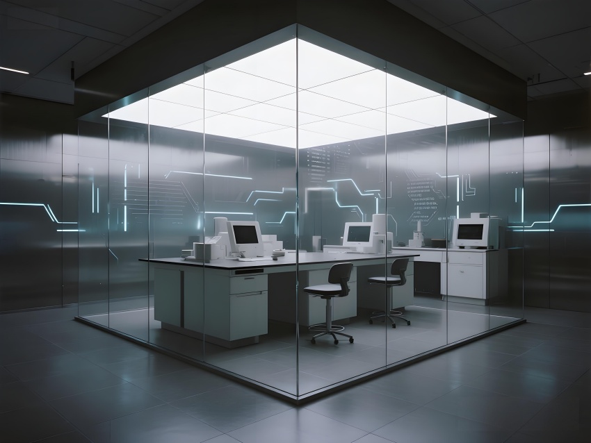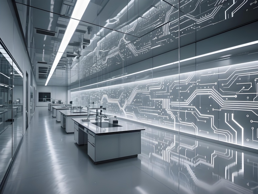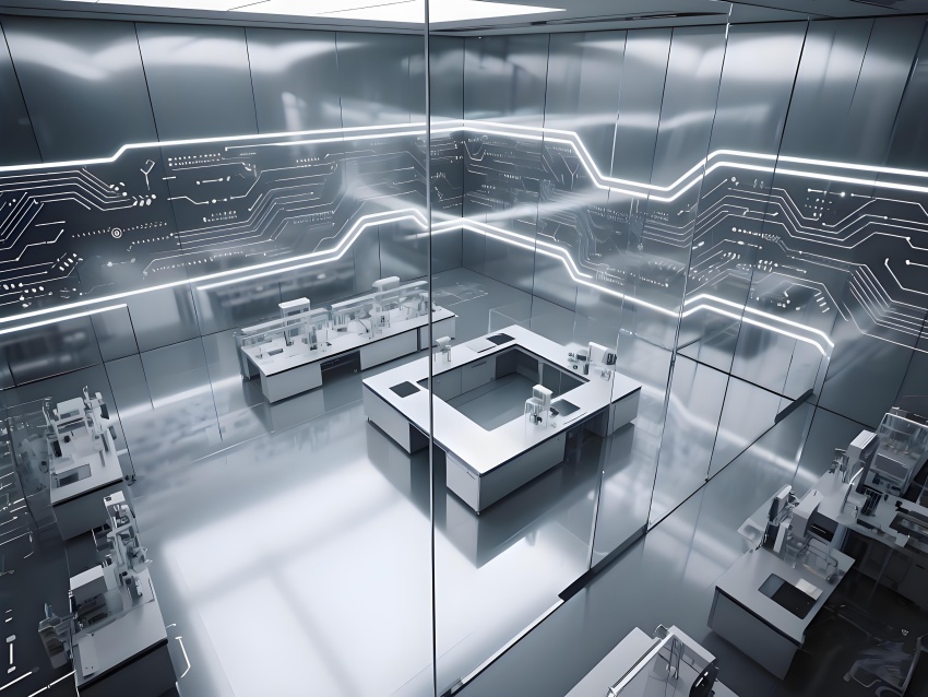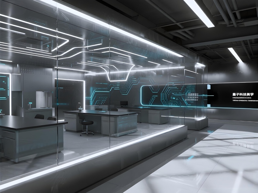 本實驗室采用"量子科技美學(xué)"設(shè)計,將納米尺度的精密感轉(zhuǎn)化為空間敘事。主實驗區(qū)以鏡面銀與深空灰為基調(diào),半透明防輻射玻璃墻體內(nèi)嵌電路板紋理光帶,象征微觀世界的電子軌跡。百級潔凈區(qū)的金色氣流箭頭與千級區(qū)的藍色光暈形成能級躍遷般的視覺分級,CVD設(shè)備艙的蜂窩狀散熱孔與懸浮式控制面板構(gòu)成未來工廠意象。地面導(dǎo)光纖維模擬分子結(jié)構(gòu)網(wǎng)絡(luò),天花板動態(tài)粒子監(jiān)測屏以數(shù)據(jù)流形式投射納米顆粒分布。通過冷調(diào)LED與設(shè)備熒光的層次照明,在滿足EMI屏蔽與化學(xué)防護需求的同時,創(chuàng)造出如同操作量子領(lǐng)域的沉浸式科研環(huán)境,透明氣閘門上的全息警示標(biāo)志進一步強化尖端材料研究的科技儀式感。