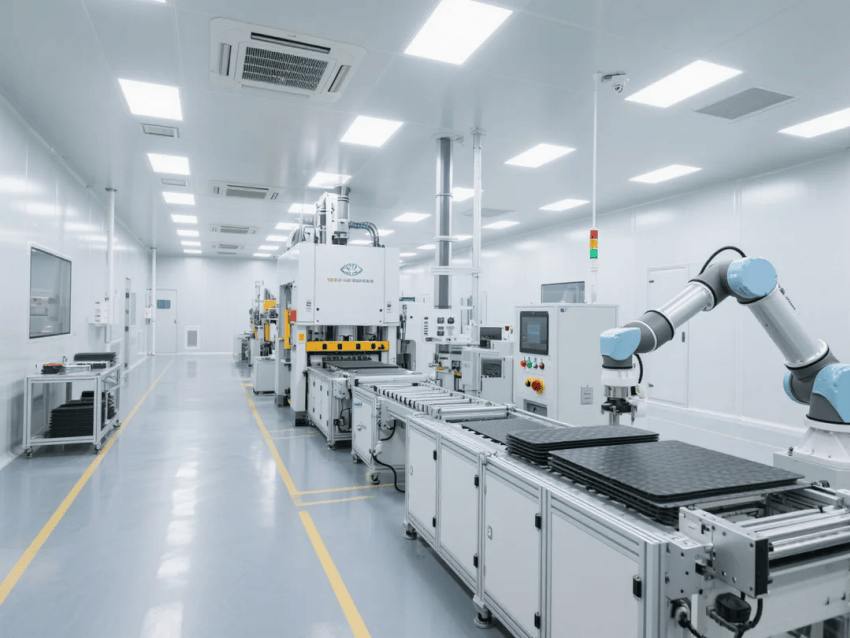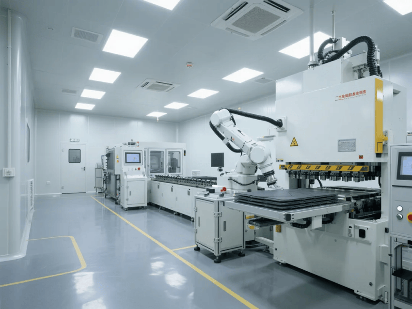 智能化配置:集成環(huán)境監(jiān)測與設(shè)備聯(lián)動(dòng)系統(tǒng),白色彩鋼板墻面嵌裝LED智能看板,實(shí)時(shí)顯示生產(chǎn)數(shù)據(jù)與潔凈參數(shù)。機(jī)械臂工作站配備藍(lán)光定位系統(tǒng),與金屬灰地坪形成科技視覺呼應(yīng)。