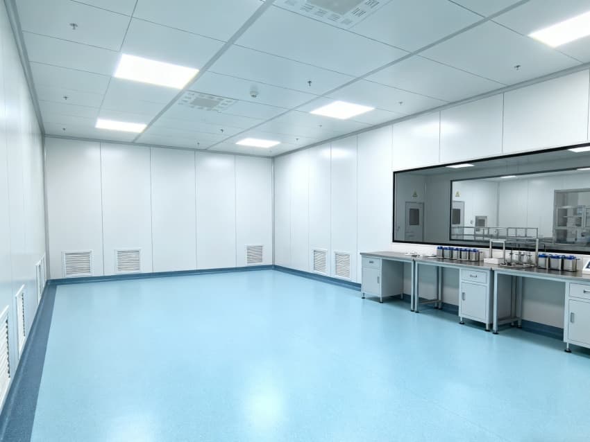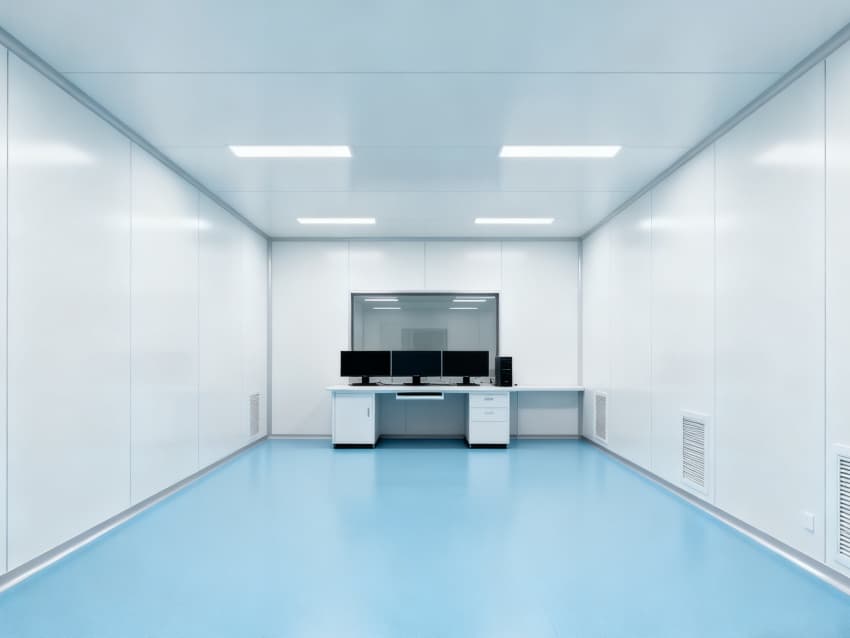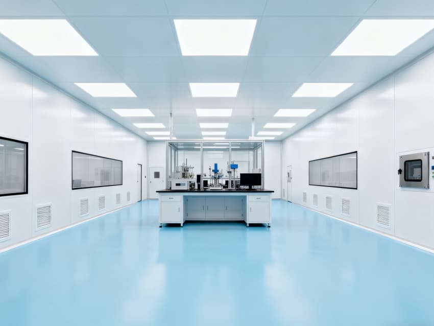 車間環境控制優勢顯著:地面采用淺藍色防靜電環氧材質,有效規避靜電對量子元件的干擾;四周白色抗菌墻面經特殊涂層處理,粉塵附著率低于0.1%,配合全密封吊頂設計,可維持千級潔凈度,滿足量子器件對微環境的極高要求。?