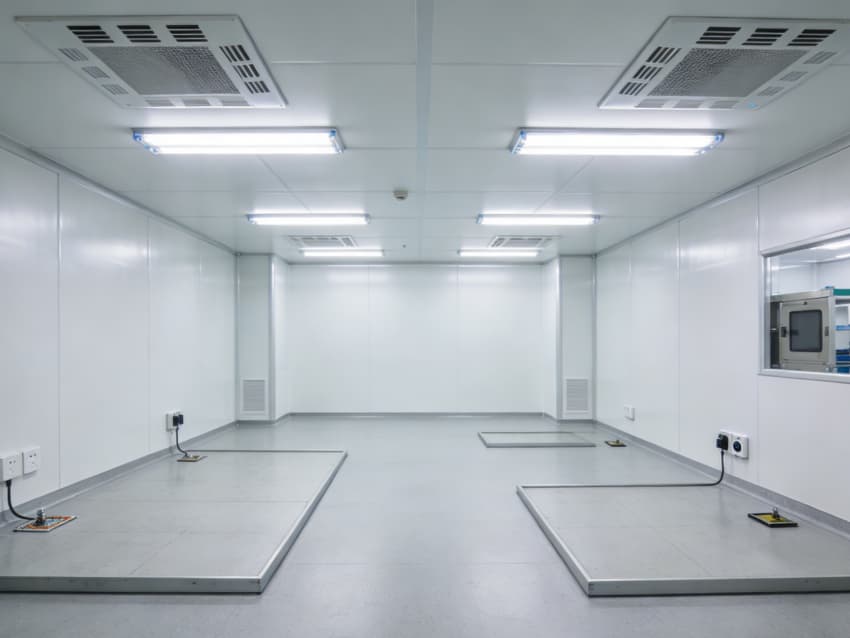 核心施工工藝,嚴控潔凈與防護性能。圍護結構選用0.8mm厚工業級抗菌彩鋼板,芯材采用防火保溫巖棉,拼接處用專用潔凈密封膠滿填,膠縫寬度3-5mm無氣泡、無開裂,墻角做≥50mm圓弧處理,避免微粒堆積與清潔死角。地面采用無縫防靜電環氧自流平,表面電阻控制在10?-10?Ω,平整度誤差≤2mm,耐磨損、易消殺,同時鋪設防靜電接地系統,杜絕靜電損壞精密顯示組件;墻面、吊頂光滑平整,無揚塵、無脫落,適配高頻消殺需求。