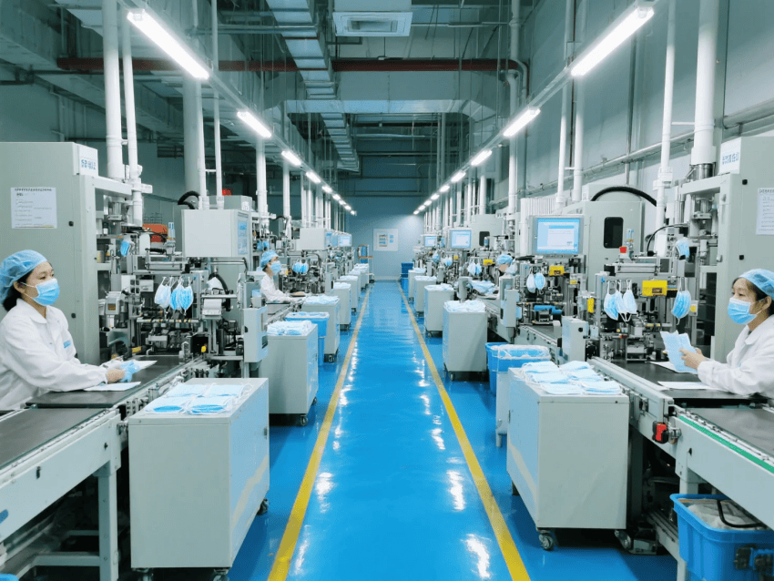 本方案采用"醫療工業極簡風",符合YY/T0969-2013口罩行業標準。車間按功能分區: 原料區(熔噴布恒溫儲存23±2℃) 生產區(超聲波焊接噪音<75dB) 滅菌