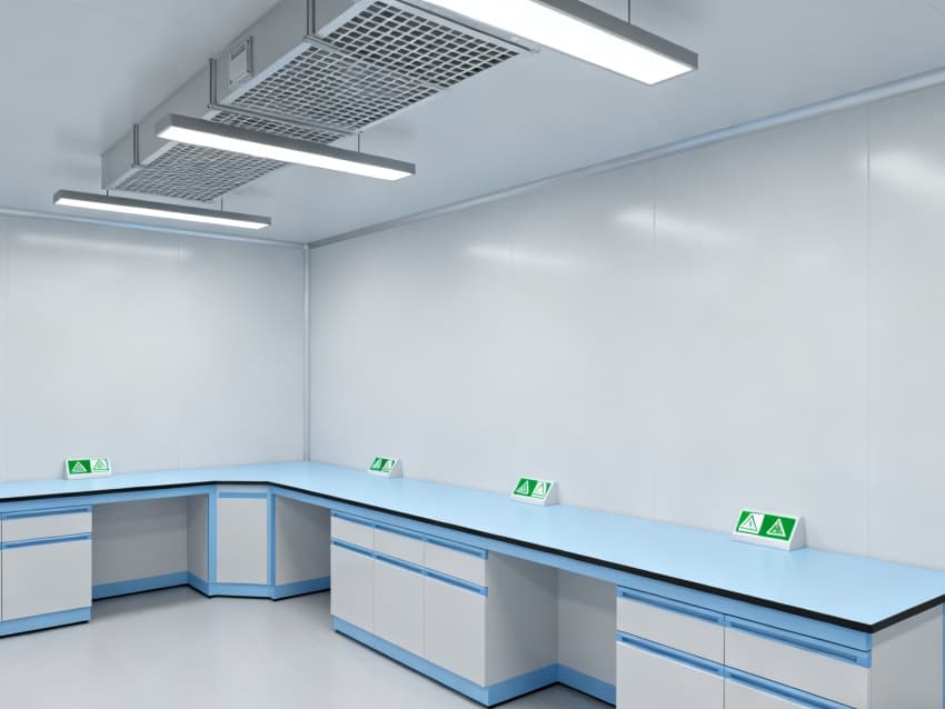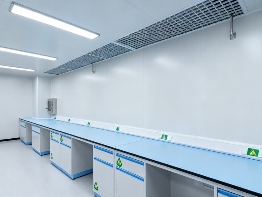 在核心操作區域,我們執行的是高標準的潔凈要求,每立方米空氣里直徑0.5微米以上的灰塵、顆粒等雜質不能超過352000個,相當于達到了萬級潔凈標準(國際ISO8級)。而像走廊、儲物間這些輔助區域,要求會稍微低一些,執行的是十萬級潔凈標準(國際ISO9級)。采用初效-中效-高效三級空氣過濾系統,配合側送頂回氣流設計,實現每小時18-22次空氣置換;墻面選用耐酸堿潔凈彩鋼板,地面為防滑PVC無菌卷材,所有邊角做圓弧密封處理,減少清潔死角。室內溫度穩定在22±2℃,相對濕度控制在45%-55%,關鍵實驗區維持微正壓,有效隔絕外界污染與交叉感染,既符合高校生物實驗教學規范,也為科研數據準確性提供可靠環境保障。